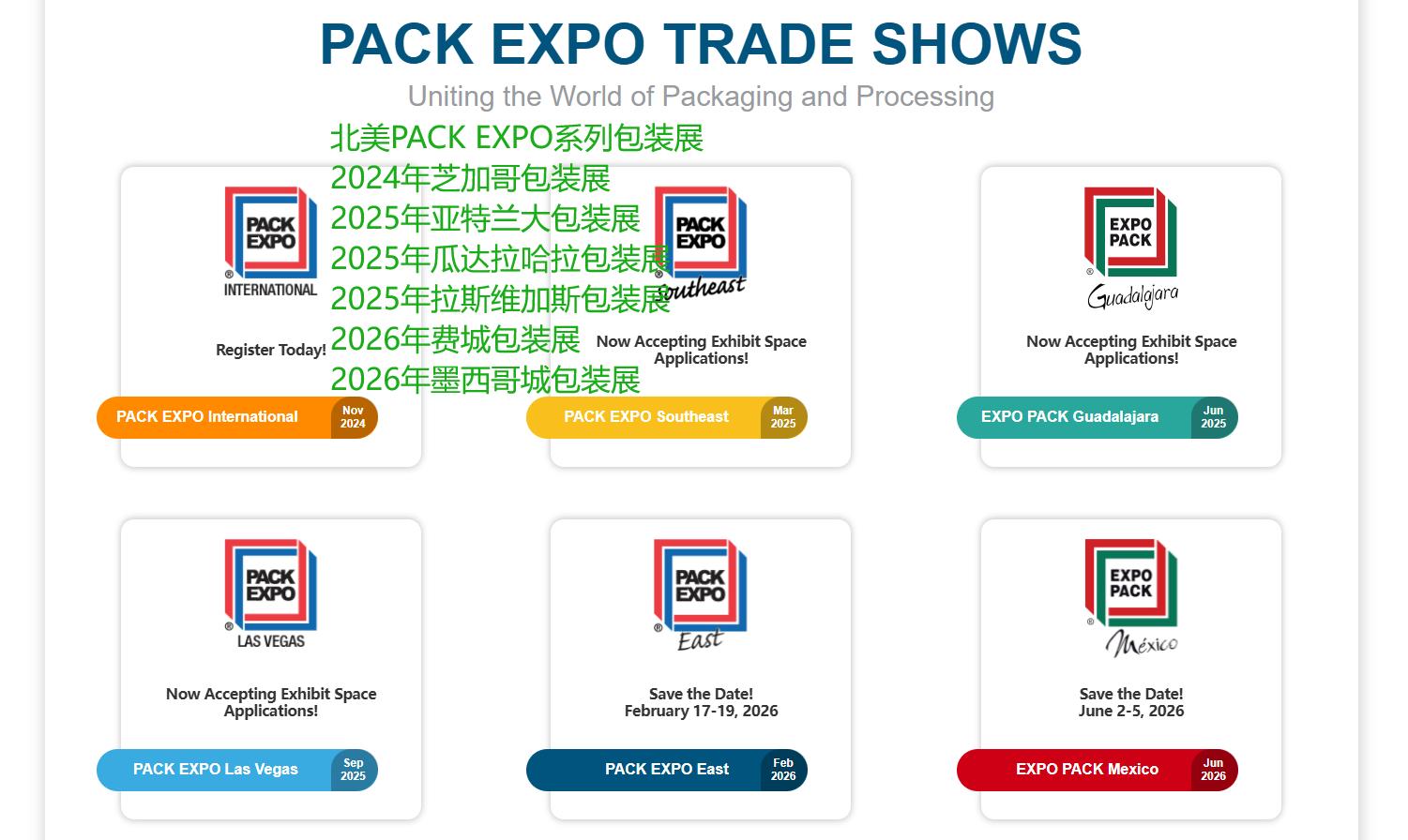 PACK EXPO系列是由包裝和加工技術(shù)協(xié)會PMMI組織的一系列專注于包裝和加工行業(yè)的貿(mào)易展。其中美國芝加哥包裝展Pack Expo International是北美包裝展系列展會的旗艦展,每兩年在伊利諾伊州芝加哥舉行一次。它是包裝和加工行業(yè)規(guī)模最大、最全面的貿(mào)易展之一。