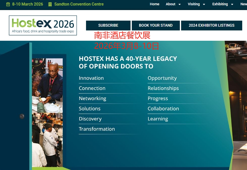 南非約翰內(nèi)斯堡國際酒店及餐飲業(yè)展覽會(Hostex)始于1986年,是非洲規(guī)模最大且最具聲望的食品、飲料及酒店行業(yè)盛會。經(jīng)過多年發(fā)展,已成為連接全球供應商與非洲市場的關(guān)鍵平臺,在推動行業(yè)發(fā)展、促進貿(mào)易合作方面發(fā)揮著重要作用。
