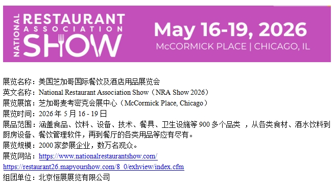 2026年美國芝加哥國際餐飲及酒店用品展覽會展覽名稱:美國芝加哥國際餐飲及酒店用品展覽會英文名稱:NationalRestaurantAssociationShow(NRAShow2026